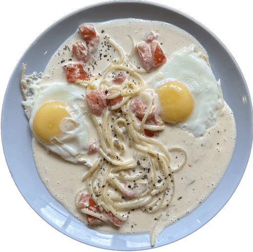 помидоры, яйца, спагетти, сливки, сыр Эдем, базилик